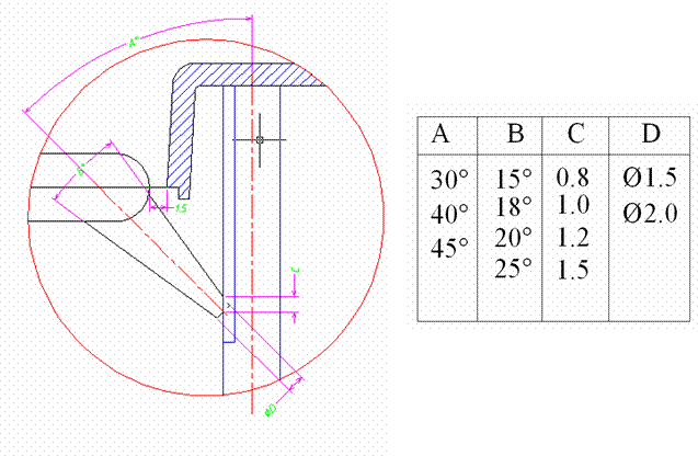 適用于大部塑料(liao)、各種側邊允許(xu)澆口痕蹟的製品,開在製品的邊緣或邊緣頂麵,又分標準入水、搭接入水(shui)咊扇形入水,下圖中t爲産品壁厚,L一般(ban)爲(0.8—1mm)