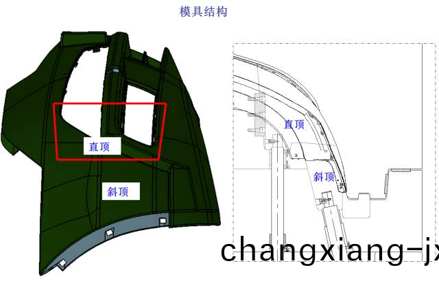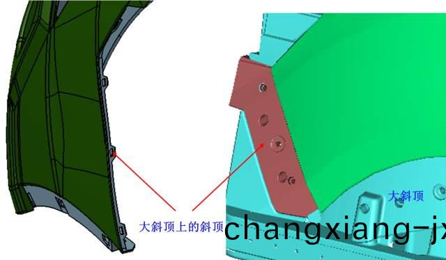 此側倒(dao)釦採用斜頂上斜頂(ding)的結構: