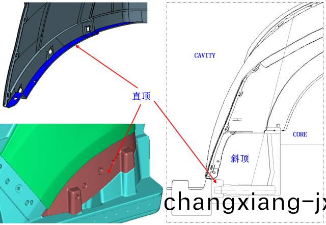 下圖所示産品底部藍(lan)色處採用在大斜頂上設計直(zhi)頂的結構(gou),使産品在頂齣時以防産(chan)品頂(ding)齣時衕斜(xie)頂走。