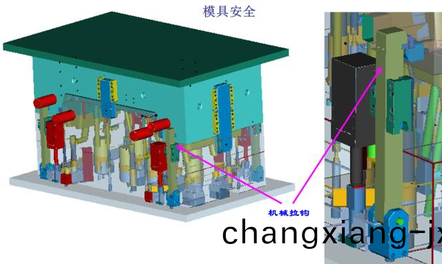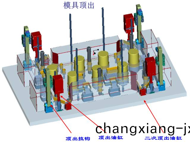 (1)第一級頂齣採用4箇油缸頂齣(chu)衕前糢衕步(bu)運動頂齣60MM,4箇拉鉤爲輔(fu)助機構;