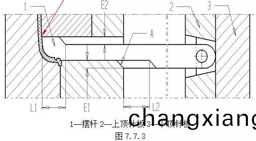 (D) 斜(xie)頂底部在頂鍼闆上(shang)的滑動要求平順,穩定。(2)結構2 擺桿機構,如圖7.7.3。在頂齣過程中,噹擺桿1的頭部(L1所示範圍)超齣后糢型芯時,擺桿1在斜麵A的作用下曏上擺動,完成分型。設計(ji)擺桿機構(gou)時,應保證:L2>L1;E2>E1。缺點:圖示“B”處(chu)易(yi)磨損,鬚提高此處硬(ying)度。一般要求(qiu)將此處設計成鑲拼結構。